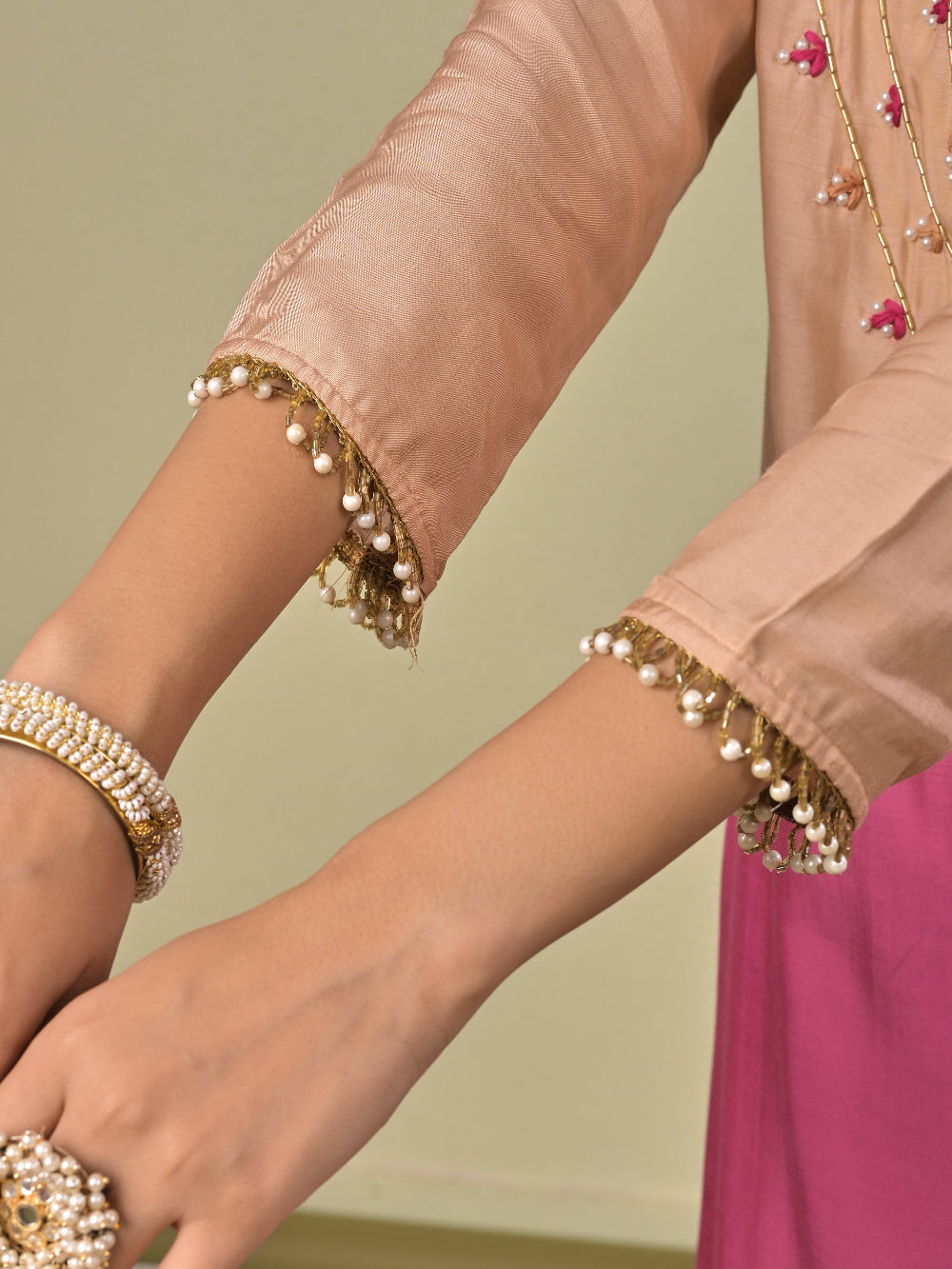 Beige Wine Ombre Hand work Muslin Silk Kurta set with organza dupatta
